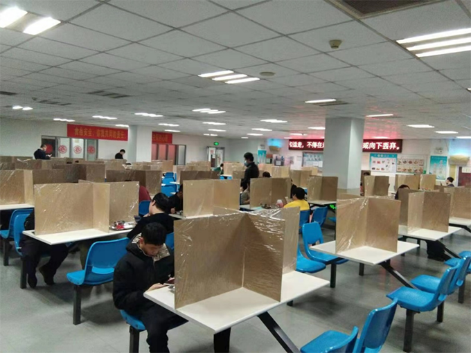 公司總部彩田園區(qū)鼓勵員工自帶午餐、分散進(jìn)餐,為此緊急采購一批微波爐保障使用;各子公司食堂因地制宜,采取分時段就餐、分區(qū)域進(jìn)餐、獨立包裝配餐等方式滿足員工用餐需求,盡可能減少員工在食堂停留時間。為避免員工就餐聚集,各工廠食堂利用紙板制作“桌面隔離墻”,更進(jìn)一步確保就餐安全。公司工會系統(tǒng)招募義工為就餐人員噴灑消毒液、引導(dǎo)緩解人流,解決服務(wù)人員不足問題。