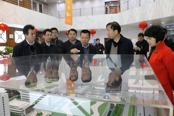 陳朱江(前排右三)向肖亞非(前排右二)介紹園區(qū)情況。