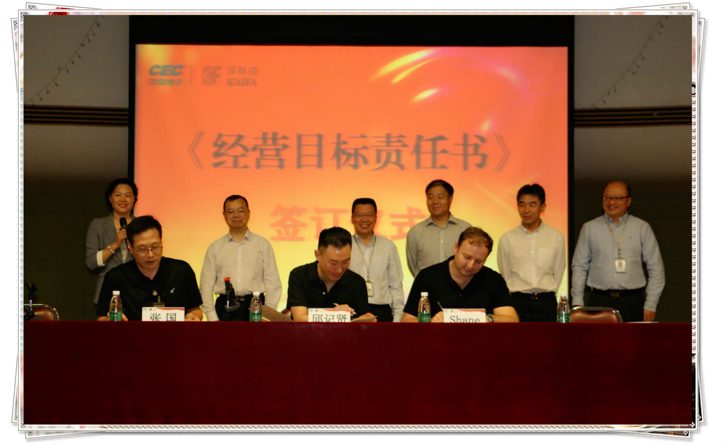 (↓ 莫總與開發蘇州總經理史初浪、開發惠州總經理謝少華、開發東莞總經理王勁剛、關鍵零部件事業部總經理熊維龍簽署經營目標責任書)